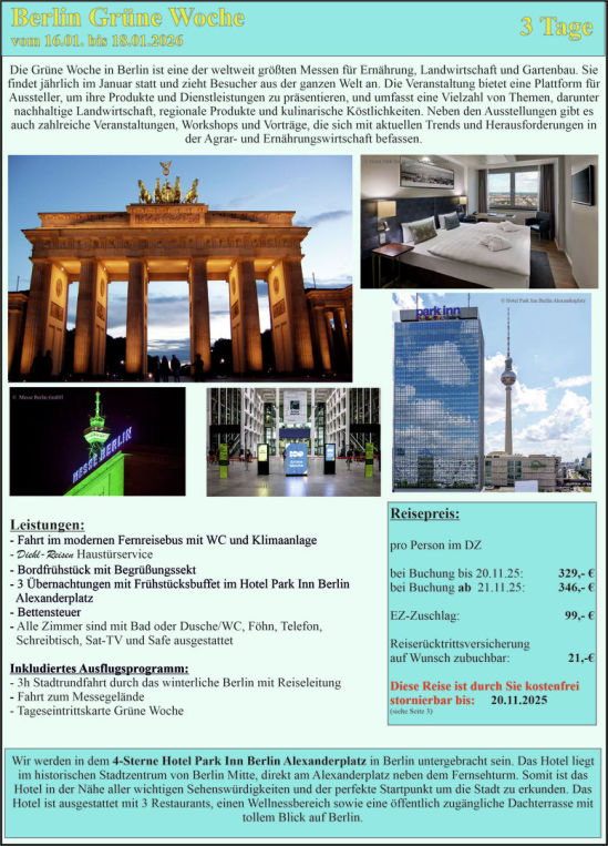 Buchungswünsche können Sie gerne auch auf unserem Anrufbeantworter hinterlassen oder die einzelnen Reisen hier direkt online buchen.
