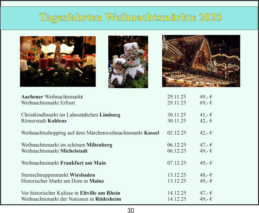 Online buchbar unter "Reiseprogramm 2025 / Weihnachtsmärkte", oder telefonisch unter 02752-816 , -817