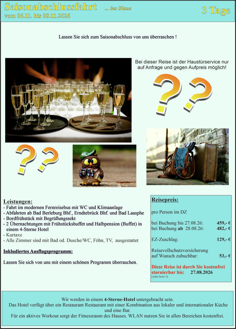 Die genauen Zustiege und Uhrzeiten teilen wir Ihnen ca. 10-14 Tage vor Abfahrt schriftlich mit.